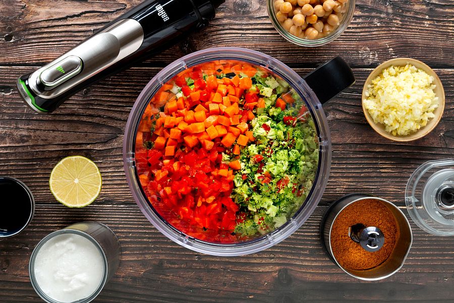Легко нарезает кубиками овощи и мясо, натирает сыры и мягкие продукты, измельчает твёрдые ингредиенты, замешивает густое тесто.